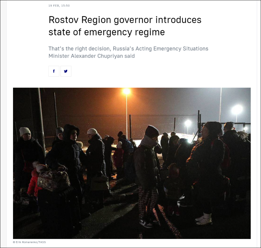 香港新聞網2月21日電 俄烏危機懸而未決,烏東地區不斷發生的炮擊事件又給本已緊張的形勢增添了不確定性。 2月17日起,頓巴斯地區形勢惡化,自行宣佈獨立的“頓涅茨克人民共和國”和“盧甘斯克人民共和國”多次稱遭到來自烏克蘭方面炮擊,為此緊急疏散上萬人至俄羅斯,老年人、婦女和兒童是優先疏散對象。受此影響,上萬人湧入俄羅斯境內,俄邊境羅斯托夫州19日宣佈進入緊急狀態。