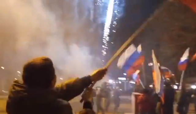 香港新聞網2月22日電 當地時間21日,俄羅斯總統普京簽署命令,承認烏克蘭東部的“頓涅茨克人民共和國”和“盧甘斯克人民共和國”。得知這一消息後,頓涅茨克地區的民眾走上街頭,高呼“俄羅斯”,並燃放煙花。