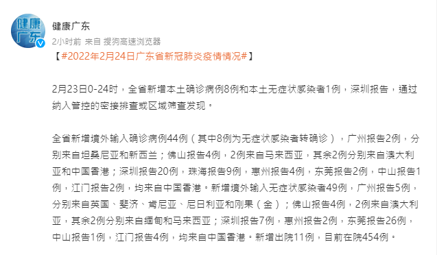 香港中通社2月24日電 據“健康廣東”微信公號消息,2月23日0-24時,廣東省新增本土確診病例8例和本土無症狀感染者1例,深圳報告,通過納入管控的密接排查或區域篩查發現。