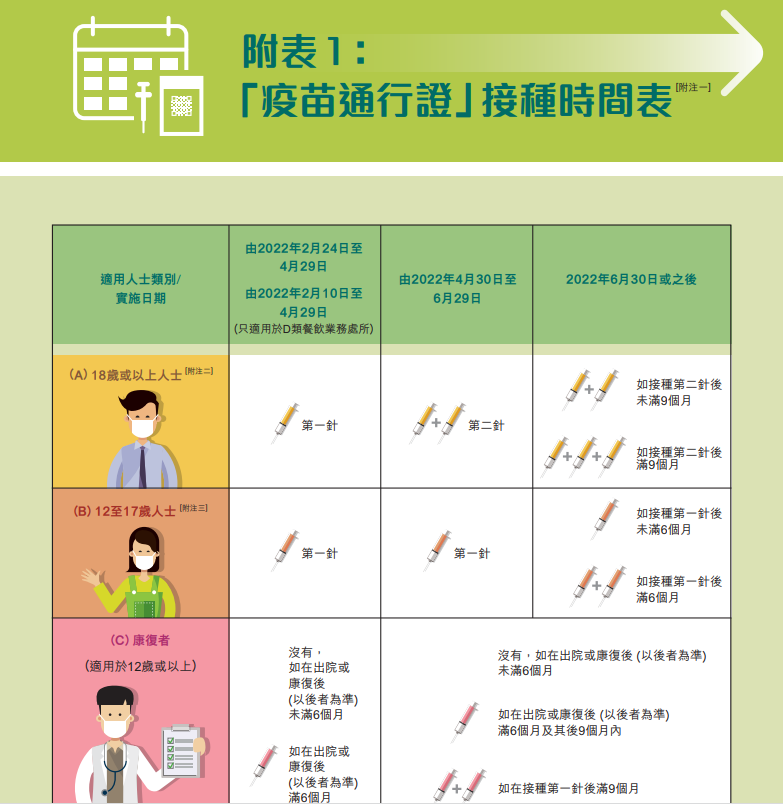 香港政府設立疫苗通行證網頁 香港政府網站截圖 香港特區政府食物及衛生局副秘書長蔡傑銘介紹 “疫苗通行證”措施將分為3個階段逐步落實,一般人士最終需接種三針。在現時至4月29日為第一階段,要求12歲以上人士需接種一針。 不同處所會設主動查核及被動查核處理。 主動查核處理的處所,包括餐飲處所及會址,顧客在進入此兩類處所時需主動出示接種記錄或豁免證明書二維碼,再由處所負責人利用政府開發的驗證二維碼掃描器應用程序掃描二維碼。 被動查核處理,如新加入的商場、百貨公司、街市、超市、市集等,處所負責人須在入口展示相關內容,雇主需確保員工符合“疫苗通行證”要求,但顧客無須主動出示打針記錄,不過執法人員可抽查。