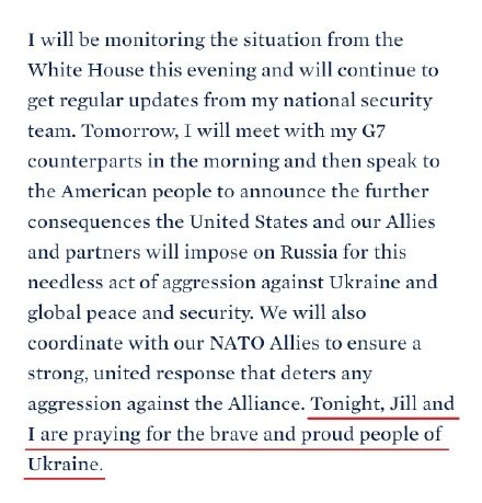 就在俄羅斯總統普京宣布將在烏東部頓巴斯地區開展特別軍事行動後不久,美國總統拜登發表聲明稱:“今夜,我和吉爾(第一夫人)一起,為勇敢自豪的烏克蘭人民祈禱。”