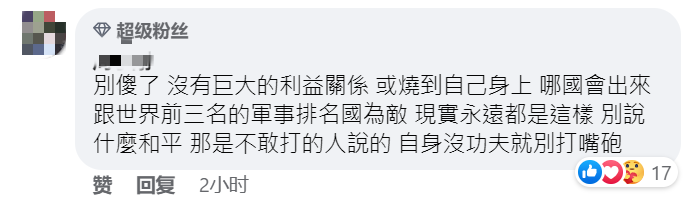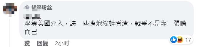 不過,隨即有更多理智的島內網友對這種言論進行了糾正:“別傻了!火沒有燒到自己身上,誰會跟世界排名前三的軍事強國硬碰硬!”