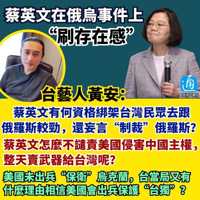 (香港新聞網製圖) 日前有消息稱,若未來俄烏局勢持續惡化,台灣可能禁止半導體等科技類產品輸入俄羅斯。對此,台“經濟部”昨日(23日)回應稱,“會依照參與國際條約及貿易管制的作為”,配合“國際夥伴”修改相關管制措施。 台灣地區領導人蔡英文也於昨日發文,“譴責”俄羅斯對烏克蘭的“入侵”,還將烏克蘭和台灣相提並論進行炒作。 眼見台當局如此上躥下跳,常在社交平台點評時事的台灣藝人黃安前後發布兩條博文,批評台當局跟著美日 “譴責” 俄羅斯的行為是強行“刷存在感”。 黃安質問,1999年,北約在沒有聯合國的授意下,私自轟炸南斯拉夫、科索沃,連中國大使館都被“誤炸”,蔡英文譴責了嗎?美國此前掏出一包“洗衣粉”,以所謂伊拉克有大規模殺傷性武器為由侵略伊拉克,蔡英文譴責了嗎? 黃安直指,蔡英文作為一個只剩下兩年任期的台灣地區領導人,有什麽資格“綁架台灣民眾去跟俄羅斯較勁”,甚至還妄言“制裁”俄羅斯? 他又指出,俄羅斯軍隊進入烏克蘭,自詡“世界警察”的美國卻並未出兵“保衛”烏克蘭,嘲笑台當局“又有什麼理由相信美國會出兵保護台獨?拜登已經公開說他‘反對台獨’,只有在民進黨忽悠下的笨蛋,才相信台獨會成功。” 對於蔡英文昨日針對烏克蘭情勢做出的四項“指示”,黃安亦一一作出回懟。 在“指示”中,台當局譴責俄羅斯侵害烏克蘭主權。就此,黃安反問“怎麼不譴責美國侵害中國主權,整天賣武器給台灣呢?” 而台當局所謂要“理性和平解決爭端”的言論,其實自己都沒做到。黃安就拿日前被網暴的中國台北選手黃郁婷為例,揶揄民進黨當局:“反對你的,就喊打喊殺,你們對黃郁婷(因穿中國國家隊隊服而被台當局政治追殺的冬奧會中國台北運動員)理性和平嗎?” 至於蔡英文“指示”的“台海軍事準備”,黃安更直接戳穿台當局的老底,諷刺台軍“不就那點兒家底兒嗎?” 最後,黃安直言蔡英文所謂“維持物資物價穩定”的“指示”更是可笑。台灣的“鷄蛋荒”還未解決,連鷄蛋的穩定供應都維持不了的台當局,“還關心到俄羅斯、烏克蘭的事兒”。 台當局不聚焦於島內民生問題,卻忙著抱緊美國大腿,跟著“制裁”俄羅斯,這也引起了一些島內網友的不滿。 在相關新聞的評論區,有網友表示,“台灣制裁俄羅斯?實在好笑……”“雖然半導體是台灣強項,但也沒必要跟隨美國腳步,蔡英文是想表現給美國看嗎?”