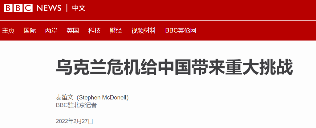 香港新聞網2月28日電 俄烏開戰,英媒BBC卻一天到晚地“碰瓷”中國? 昨日(27日),BBC中文網發表題為“烏克蘭危機給中國帶來重大挑戰”一文,聲稱中國在接下來的外交、貿易等許多方面都面臨“重大挑戰”。