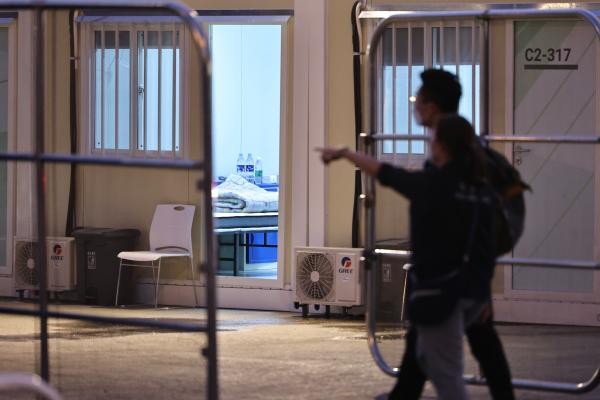 香港中通社圖片 青衣方艙醫院由一個個模塊化箱式房屋組合而成,環境整潔寬敞,病房門外採用綠色、米白色等清晰的顏色,讓人眼前一亮的同時也頓感心情舒暢。