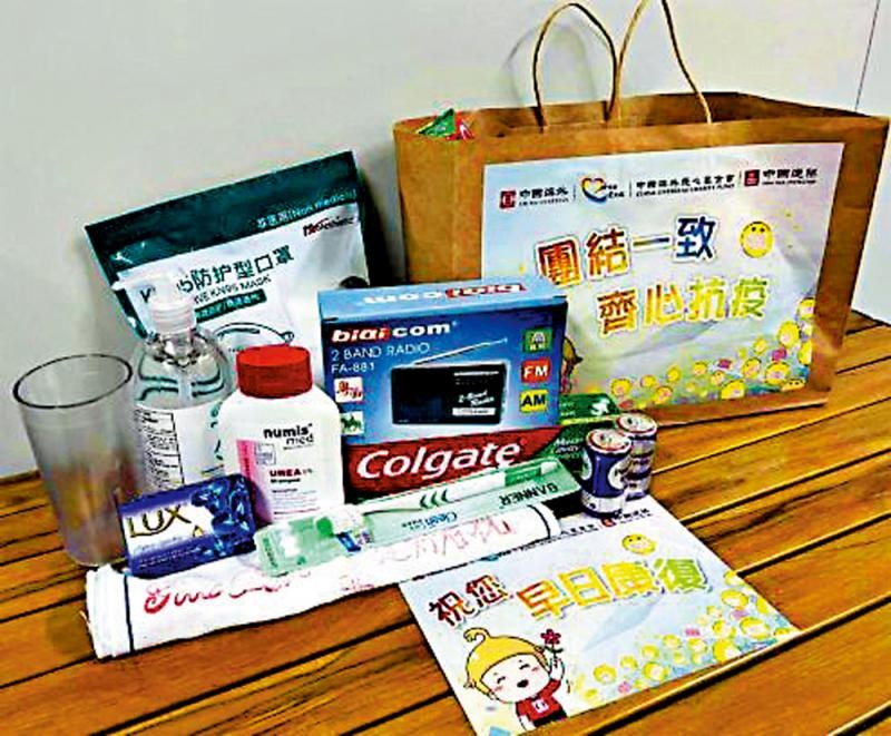 圖片來源:大公報 除了每個床位均配有床頭櫃、台燈外,該項目承建商中國海外集團有限公司還向入住青衣方艙醫院的患者派發愛心包,內部裝有毛巾、梳洗用品、N95口罩及酒精搓手液等物品,還特意附上“祝您早日康復”的卡通貼紙,為患者加油打氣。