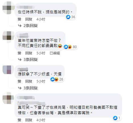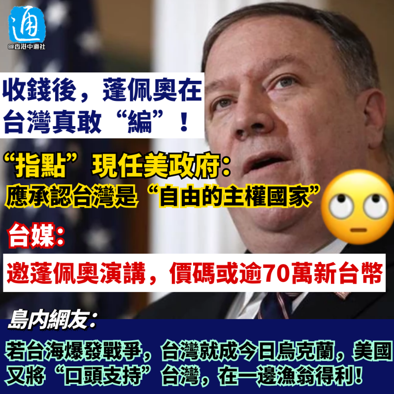 (香港新聞網製圖) 在演說中,蓬佩奧雖 “自謙”如今只是一介平民,卻“指點”起現任美國政府,聲稱美國應立即給予台灣所謂“外交”承認,承認台灣是一個“自由的主權國家”,還叫囂這是“正確且明顯的事”, 不應再被美政府“忽略、躲避或視為次等”。 隨後,蓬佩奧又在社交平台上重複了這番涉台錯誤言論。 蓬佩奧竄訪台灣並發表演說的消息引起了島內媒體的關注和報道。然而,就在綠媒為蓬佩奧的發言感動自嗨之時,台灣《聯合報》卻提出一個耐人尋味的問題:邀請蓬佩奧訪台並發表演講的遠景基金會,通常邀請卸任官員演講的代價多少? 《聯合報》援引美媒消息披露,白宮印太事務協調總監坎貝爾在加入拜登團隊前,以卸任官員身份接受遠景邀請通過視頻發表演說,價碼高達2.5萬美元(約合70萬元新台幣)。熟悉台美外交事務人士說,以蓬佩奧的層級,價碼只會更高。 得悉蓬佩奧或是“收錢演講”,又在兩岸關係緊張之際不斷地煽風點火,不少島內網友都對這位美國前高官的竄訪感到不滿! 有網友諷刺道,當年蓬佩奧在任時什麽都沒做,“現在是喊爽的”,畢竟“不用抗責任的都最勇敢”。 “一個卸任的政客,憑什麽來別人家指手畫腳?”有網友直言,蓬佩奧此次竄訪台灣及演講“應該拿了不少好處,天價。”