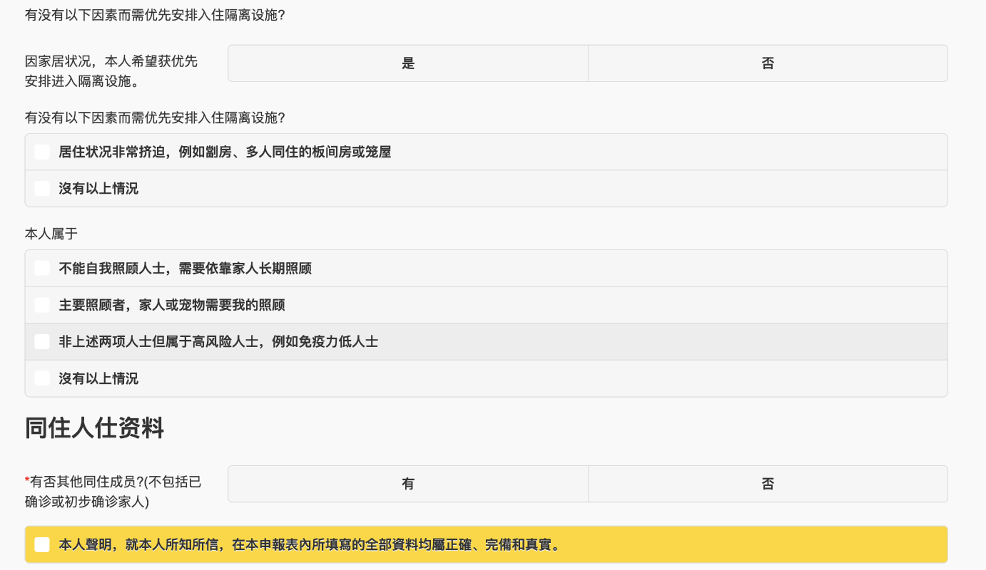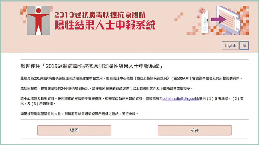 快測呈報平台網頁截圖 據文匯報報道,對於昨日(7日)單日新增確診數字回落至約2.5萬宗,衞生防護中心總監徐樂堅表示,在嚴厲的社交距離措施下,確診個案每隔3天至5天出現倍數上升的情況放緩,呼籲香港市民積極配合居家抗疫政策,期望能減慢傳播速度。但他亦不排除是市民改用快測取代核酸檢測,使確診數字未能反映實際疫情。 徐樂堅表示,為防止系統出現擁堵,上月26日起至本月5日期間快測呈陽性的市民,可於系統啟用後一星期內(即本月14日或之前)補交資料,未來所有申報必須在檢測呈陽當日或翌日進行。