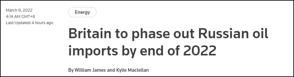 路透社報道截圖 據路透社8日報道,英國進一步加強對俄制裁,將在2022年底前逐步停止進口俄羅斯石油和相應產品。預計英國將逐步改從美國和中東購買石油。英國商務大臣科沃滕(Kwasi Kwarteng)表示,企業和供應鏈“有充足的時間”進行調整。他敦促企業“利用今年剩下的時間確保過渡平穩,以免消費者受到影響”。目前,英國尚未宣佈是否停止從俄羅斯進口天然氣。 目前,俄羅斯石油進口占英國需求的8%。 歐盟提議:今年削減2/3俄進口天然氣 據《華盛頓郵報》報道,歐盟也將逐步減小對俄羅斯能源的依賴。歐委會3月8日提議在今年將從俄羅斯進口的天然氣削減2/3,大幅減少對俄能源依賴。本周,歐盟各國領導人將在巴黎討論這份提議。這對歐盟來說是一個巨大的能源轉向,因為歐盟對於俄羅斯能源的依賴較大。 俄羅斯原油最大買家德國此前強烈反對俄實施能源禁運。德國總理朔爾茨7日表示,進口俄羅斯能源對歐洲人日常生活“至關重要”,禁運會將歐洲能源安全置於危險境地。德方正在加快尋找替代選項,但無法在一夜之間停止進口俄羅斯能源。 【編輯:俞丹鳳】