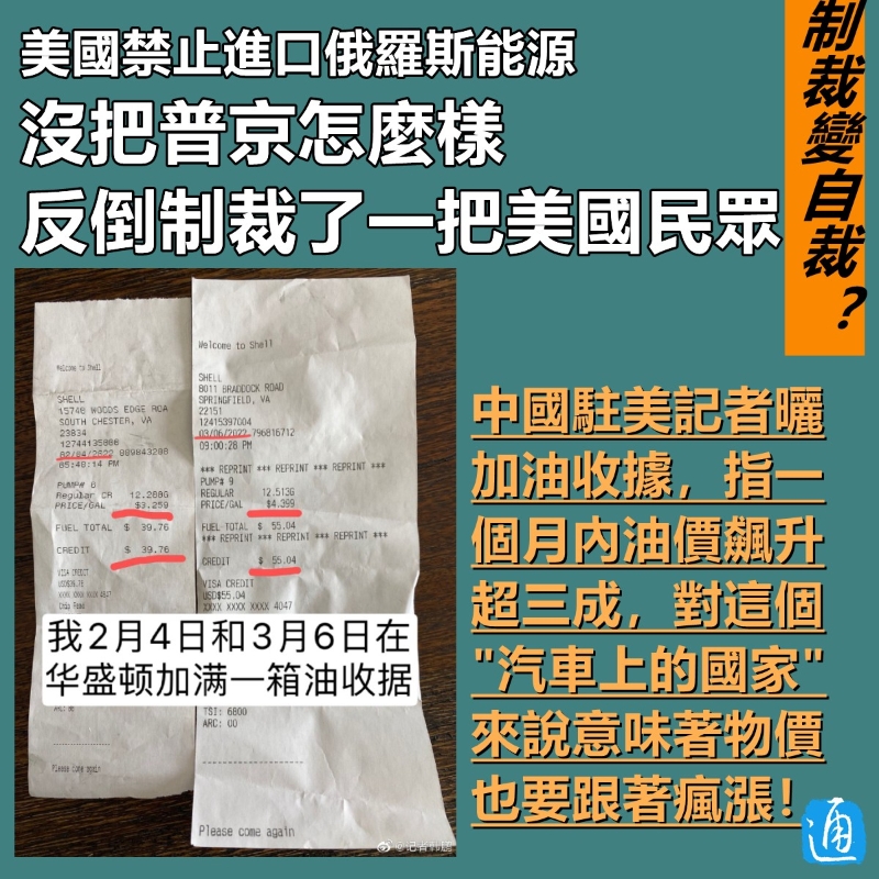香港新聞網製圖 俄烏危機爆發引起全球能源行業動蕩,油價一路飈升。8日,美國實施對俄新制裁,拜登宣佈禁止美國進口俄羅斯石油、天然氣等能源。據報道,美國當天平均汽油價格刷新了2008年7月以來的最高記錄,升至每加侖4.173美元。 這對本就苦於高油價的美國民眾來說,無疑雪上加霜。 CGTN駐美記者韓鵬9日在微博曬出2月4日和3月6日分別在華盛頓加滿一箱油的收據,對比發現,僅一個月的時間,油價漲幅接近35%。 韓鵬稱,他瞭解到的美國民眾有的表示,自己在加油站屏幕上看到要支付的數額時,遠比在手機屏幕上看到普京做了什麼要憤怒得多! 韓鵬表示,與中國國情不同,美國是“車輪上的國家”,“所有東西都靠汽車”,民眾出行也高度依賴汽車。一旦油價暴增,將牽一發動全身,引發物價瘋漲。 韓鵬引述數據指,美國7%的石油來自俄羅斯,在自己石油價格飈升時砍斷一部分石油供給,無疑讓現狀雪上加霜。他又指美國現時通脹7.5%,刷新40年記錄。 他進一步指出,美國15%的貧困人口飽腹都成問題了,華盛頓市區流浪漢越來越多,但美國政客為了制裁俄羅斯,根本沒打算管這些人的死活。 美國普通民眾也已經開始懷疑人生:美國這到底是在制裁俄羅斯還是制裁自己啊?在美國眾議院通過禁止進口俄羅斯能源法案的新聞下,有美國網民就感嘆:希望美國政客像關心烏克蘭人那樣關心他們的美國同胞!