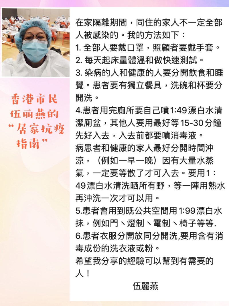 被圍封的居民 謝光磊攝 居家隔離自抗疫情,會遇到怎樣的難題?中通社記者對部分染疫患者進行了問卷調查,發現主要有四個大問題: 1、房子小,和家人同住,沒辦法做到有效隔離; 2、缺乏相應的醫學指導,網絡上信息繁雜不知真假; 3、中招突然,沒有做好準備,缺乏藥物和抗疫物資; 4、病情變嚴重,求助熱線打不通,不知道該怎麼辦; 接下來讓我們逐個擊破! 發現感染後,怎樣做好有效隔離,避免同住者染疫? 記者通過總結患者自愈的前線經驗及專家意見,得出以下四點: 第一步是迅速隔開病毒:所有人在家都要佩戴口罩和手套,盡量避免近距離講話、接觸等,讓病毒不再傳播;所有人每天起床第一時間量體溫、做快速測試,早發現,早隔離; 第二步是迅速與同住者保持距離:划出一個單獨的空間給染疫者,獨自進餐、睡覺,最好單獨使用衛生間;若無法滿足條件,則錯開時間使用衛生間,最好相隔15-30分鐘以上,洗澡也最好錯開,比如一早一晚,最好最後一個洗澡。 第三步是分開物品:染疫者使用獨立的餐具和杯子,衣服要分開放,分開洗; 第四步是做好清潔:衛生間內要用1:49漂白水及時清潔,公共地方用1:99的漂白水進行清潔(特別是容易碰到的門把丶開關丶桌椅等),同時用含有消毒成份的洗衣液或洗衣粉清洗衣物。 市民李先生講述家人成功避疫的過程 記者 朱樂怡 付鈺 這樣做,就算是同住的家人,也能大大降低感染風險,二月中不幸染疫的李先生就是靠這樣的方法,讓其家人順利躲過一劫。 香港市民伍麗燕也靠這個方法順利度過難關,伍麗燕一家五口同住一起,有四位不幸中招,但只用一周便全部康復,唯一幸免的家人也一直是陰性。