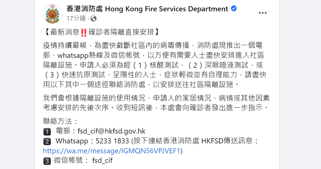 “全港社區抗疫連線”各區隔離援助二維碼 求助熱線打不通,試試這些方法 目前香港民政事務總署為“居安抗疫”計劃設立的24小時電話熱線(1833 019)已投入服務,為在計劃下進行家居檢疫的人士提供支援和協助。 但染疫人數眾多,熱線經常打不通,香港消防處日前設電郵、WhatsApp熱線、微信帳號,安排輕症染疫者送往隔離設施。