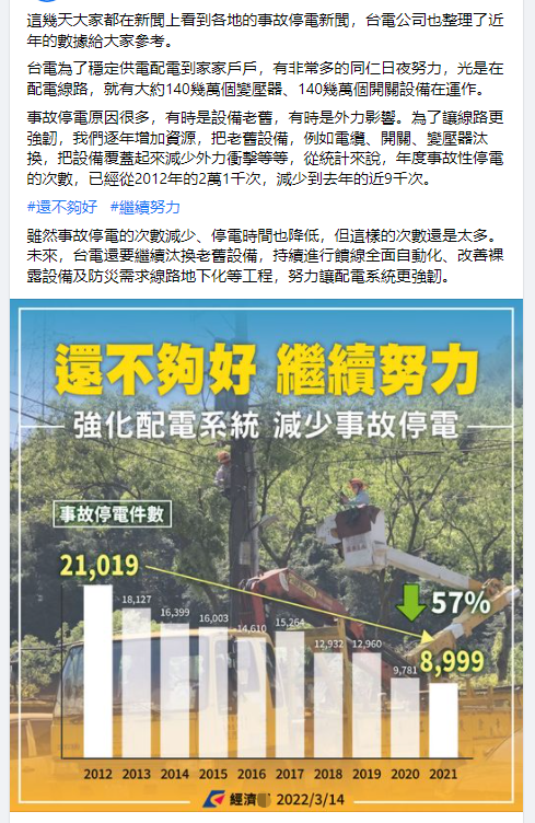 台“經濟部”臉書截圖 14日,台灣“經濟部”在其臉書專頁發布了一篇圖文,對於島內近期頻頻停電的情況,“賣慘”博同情稱,台電為了島内的配電,“有非常多的同仁日夜努力”,又辯稱“事故停電原因有很多”,且在相關部門和台電“逐年增加資源”等各種努力下,台灣“年度事故性停電的次數,已經從2012年的2萬1千次,減少到去年的近9千次”。言下之意,台灣去年的事故停電次數已經創10年新低了! 大概是想讓數據變化呈現得更直觀,更能顯示出民進黨當局有多“努力”,台“經濟部”在該貼文下方還配了一張“精心”製作的柱狀統計圖,列明了台灣2012年至2021年的事故停電數,上方標注的斜向下的箭頭,“炫耀”這十年來該數據降幅明顯,旁邊更標出了精確的計算結果——降幅達57%。 “還不夠好,繼續努力。”台“經濟部”甚至“自謙”了起來。 令人尷尬的是,就在台“經濟部“這條臉書貼文發出沒多久,台灣高雄市和基隆市又分別於15日和16日發生事故停電,導致數千戶受影響。對此,台當局聲稱停電“元兇”是松鼠和鳥。 從台“經濟部”發出所謂“洗白”圖表即知,台當局讓民眾重拾用電信心的方式並非是盡快解決島内缺電的根本問題,以及完善電網安全,而是妄圖“洗腦”民眾,現在比過去好多了!如此“比爛”,島内民眾顯然不買賬。 有網友諷刺,台“經濟部”是“滿臉誠意”地說假話。有網友則一針見血地指出,台電只是 “替罪羊”, 真正該被譴責的是當初妄言“絕不會停電”的民進黨當局。該網友指出,正因為當初民進黨當局叫停了台電的核四電廠,才埋下了台灣缺電的禍根。