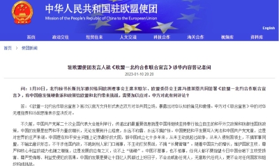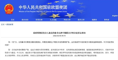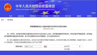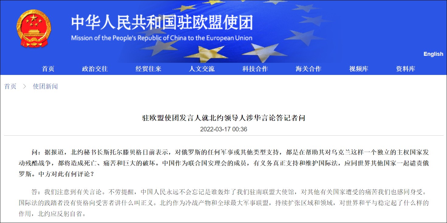 中國駐歐使團網頁截圖 據報道,北約秘書長斯托爾滕貝格日前表示,對俄羅斯的任何軍事或其他類型支持,都是在幫助其對烏克蘭這樣一個獨立的主權國家發動殘酷戰爭,都將造成死亡、痛苦和巨大的破壞。中國作為聯合國安理會的成員,有義務真正支持和維護國際法,應同世界其他國家一起譴責俄羅斯。