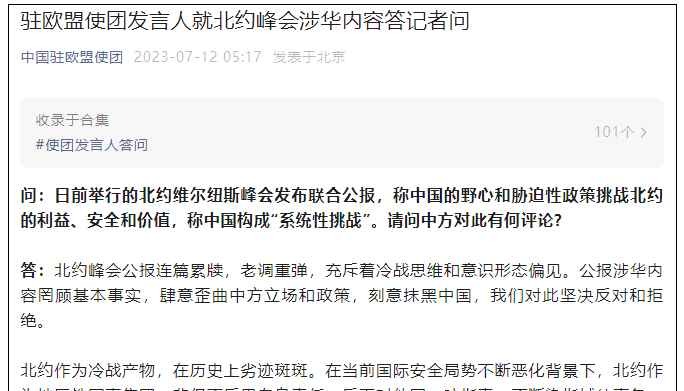 中國駐歐盟使團回應北約領導人涉華言論:北約應反躬自省分享到:
