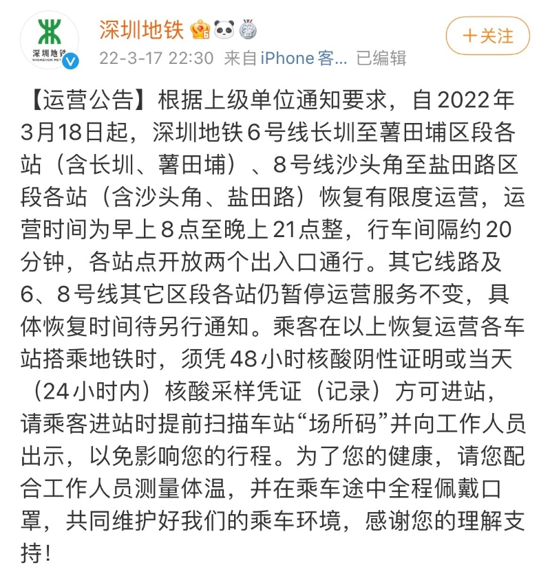深圳地鐵官方微博發佈有限度運營公告 圖源:微博截圖 據“深圳發佈”微信公眾號消息,3月17日,深圳市新冠疫情防控指揮部發佈通告,已實現社會面動態清零的鹽田區、坪山區、光明區、大鵬新區、深汕特別合作區,黨政機關、企事業單位、生產經營單位等恢復正常工作秩序和生產經營,公交、地鐵恢復運行。封控區、管控區、防範區嚴格執行疫情防控相關措施。上述措施自3月18日(星期五)起開始實施。 【編輯:王軼南】