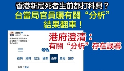 香港中通社3月21日電 香港特區政府發言人21日晚間發出新聞稿,澄清有關新冠肺炎死亡個案接種疫苗情況的報道。發言人重申,現時最重要是推動長者盡快完成接種疫苗,而香港提供的兩種新冠疫苗(科興及復必泰)均對於減低染病後重症和死亡情況高度有效,而且安全。