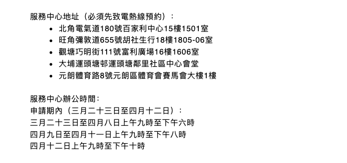 特定服務中心地址及辦公時間 四、需要什麼文件? 網上申請需申請人提供身分證件、失業證明,如解僱信或離職金紀錄。申請人須填寫個人資料、申報就業狀況、工作及以往收入。若申請人有強積金紀錄可不用提交證明,但強積金紀錄只接受今年2月8日前開設但戶口;若申請人沒有強積金戶口或屬自僱,則需要上載失業前收入及工作證明。 五、怎麼收錢? 申請人必須使用個人銀行戶口領取“臨時失業支援”計劃的資助。資助將以自動轉帳形式直接發放到申請人的銀行帳戶。如申請人曾在2020年的“現金發放計劃”下以其銀行帳戶成功收取10000元款項,“臨時失業支援”計劃的資助將會發放到同一銀行帳戶。 如申請人沒有登記“現金發放計劃”或該戶口已不適用,須於申請時提供身份證副本、收款銀行的帳戶號碼及其他證明文件(如顯示帳戶名稱及號碼的銀行月結單、存摺或提款卡副本)。# 【編輯:顏琨】