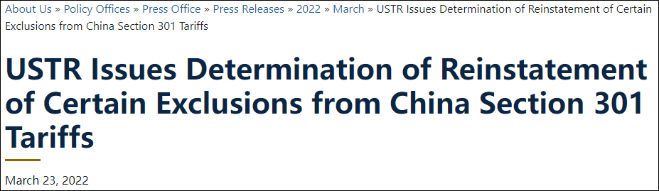 香港中通社3月24日電 當地時間23日,美國貿易代表辦公室(USTR)發表聲明,宣佈重新豁免對352項從中國進口商品的關稅,該新規定將適用於在2021年10月12日至2022年12月31日之間進口自中國的商品。