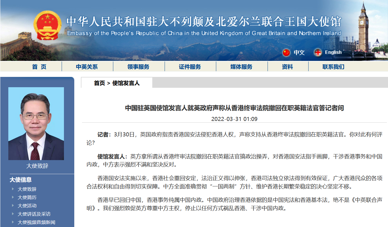 中國駐英國使館網站截圖 3月30日,英國政府指責香港國安法侵犯香港人權,聲稱支持從香港終審法院撤回在職英籍法官。