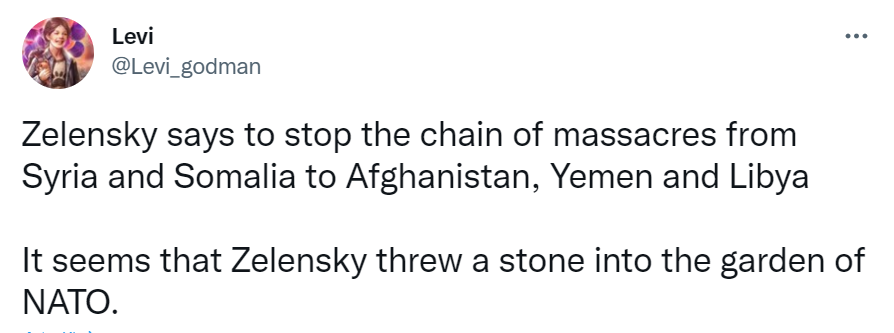 有外國網友將上述講話發表在推特上,並戲謔稱:“看來澤連斯基在北約的後花園投了塊石頭。”