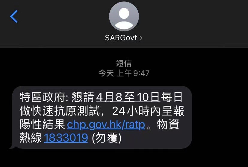 香港新聞網4月8日電 香港第五波疫情累計確診逾117萬宗。近日疫情趨緩,各方面資源較充足,特區政府呼籲市民,8日起展開一連三日的快速抗原測試,並於24小時內呈報陽性結果,以找出隱性傳播鏈,掌握社區感染情況。 政府2日起在全港十八區派發“防疫服務包”,其中包括大量快速抗原試劑盒,至6日約給270萬個家庭派發。並於7日至13日在全港設立89個“防疫服務包”補漏拾遺派發站,讓未能收到服務包的市民前往領取,為8日進行的“全民檢測”做準備。 8日早,政府通過短訊再次提醒並懇請廣大市民積極配合,於4月8日、9日、10日每日做快速抗原測試,並覆上物資熱綫。