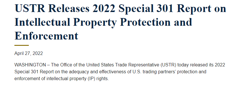 香港新聞網4月28日電 美國貿易代表處4月27日公佈2022年度知識產權黑名單,將中國、俄羅斯、印度等七個國家列入“重點監察名單”,聲稱這些國家在保障知識產權政策不足,令美國企業面臨版權及商標遭偽冒的風險。