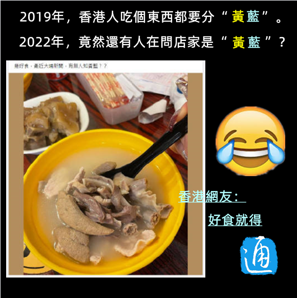 香港新聞網4月28日電 這都2022年了,香港竟然還有人吃碗東西都要問“是黃還是藍”? 有香港網友近日在社交媒體上發帖詢問,說大埔有家新開的店挺好吃,想問“是藍還是黃”。結果看到此帖的眾多網友,不分“藍”“黃”,一起笑了,紛紛留言:“現在還分什麼‘藍黃’,好吃就行,癡線(神經病)!”