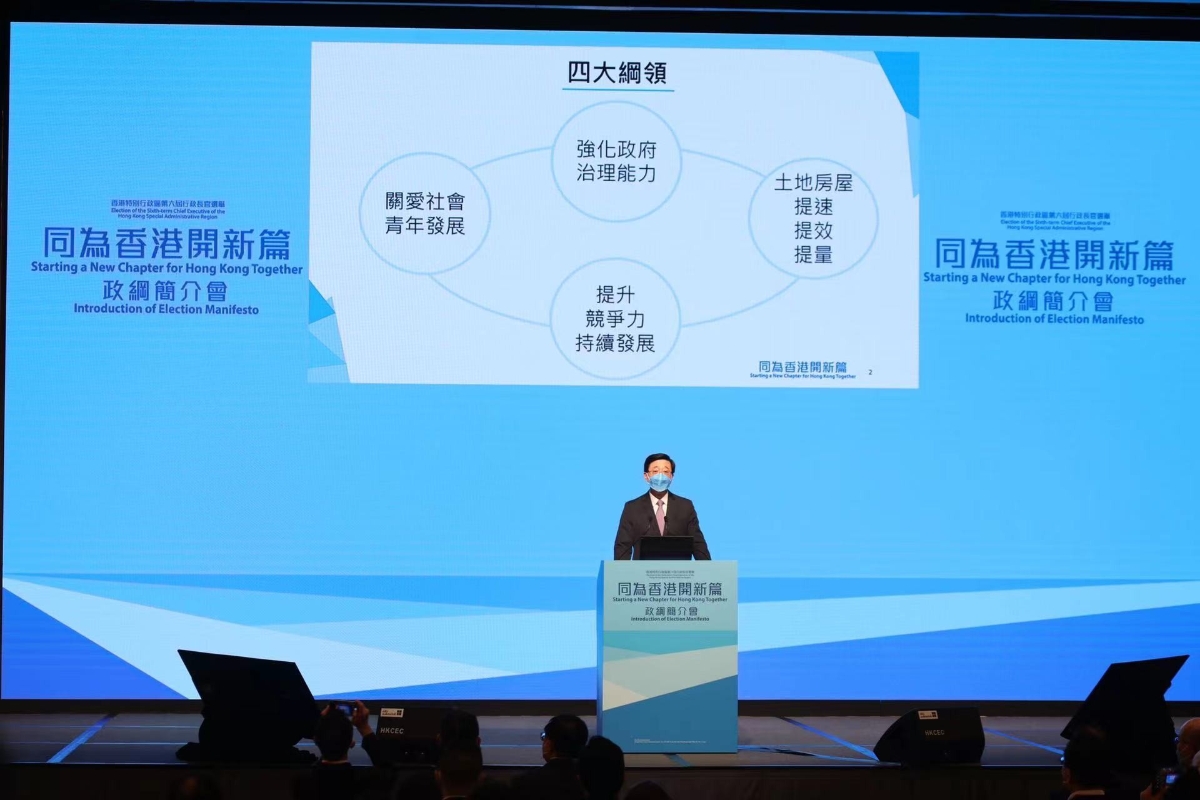 (香港中通社資料圖 謝光磊攝) 綱領中強化政府治理能力、團結一致為民解困方面;李家超表示,會透過架構重組及完善政治委任官員的設置,令政府工作更有效;並會增加新的應急動員機制,期望在應付新危機時能確保動員公務員及時應對。 政綱第二點集中住房問題。李家超提出精簡程序,以基建先行,提出公屋提前“上樓”計劃,指若公屋項目配套未齊全,市民不介意交通或買菜不方便,可選擇提早“上樓”。目標是希望縮短輪候時間1年。 綱領中全面提升競爭實力,創造持續發展空間方面。李家超提出六大方向,包括鞏固金融中心,提升核心優勢;發展創科中心,帶動經濟轉型;開發北部都會區,激活發展引擎;塑造文化之都,推動創意經濟;把握法治優勢,強化法律服務;發揮香港所長,多元自由發展。 最後,同建關愛共融社會,增加青年上流機會方面,李家超提出解決跨代貧窮試驗計劃等。他稱,探訪劏房住戶時看到學生的學習環境很惡劣,將制定整體青年政策和發展藍圖。