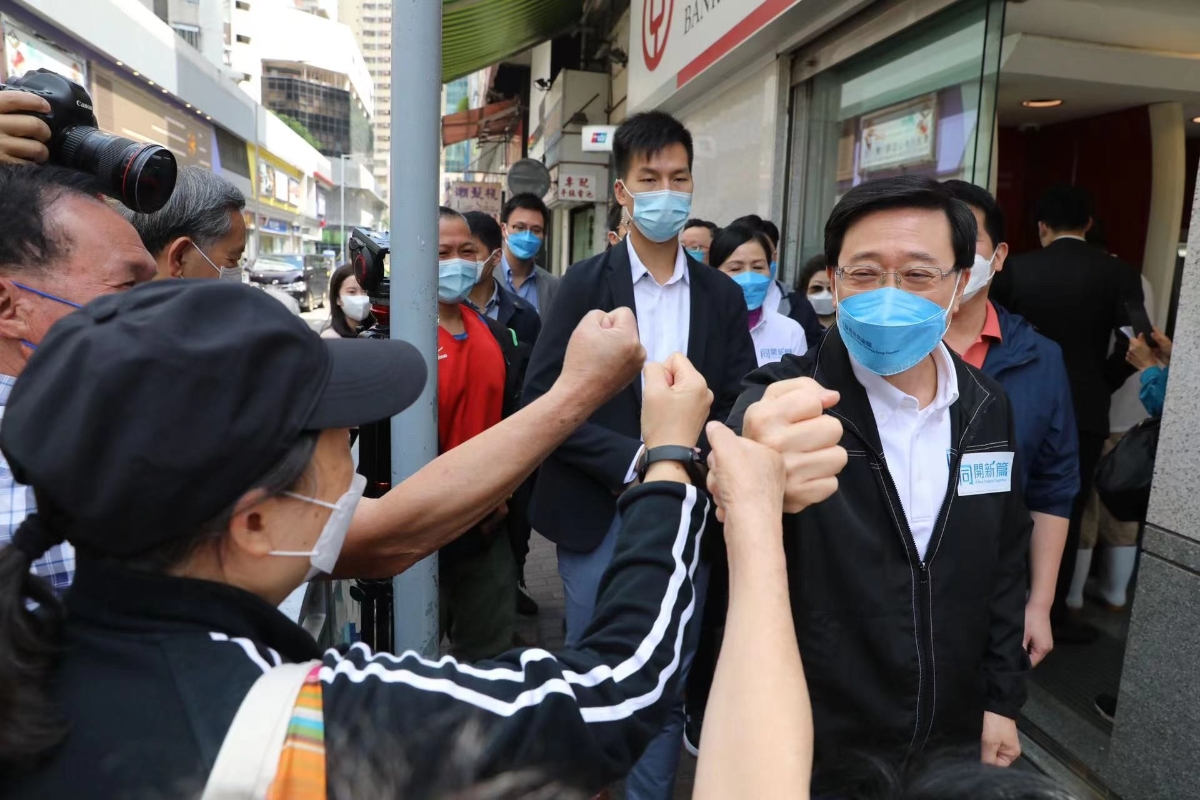 香港新聞網5月3日電 香港特區第六屆行政長官候選人李家超3日前往香港仔,拜訪香港漁民團體聯會的相關界別選委。有市民得知李家超到來,陸續趕來等候在會所外,記者現場所見馬路兩旁站滿人,其中有坐著輪椅的長者。見到李家超後,不少市民圍上來與他合影留念,還有市民當面表達對李家超的支持,豎起大拇指為他點讚。李家超一一回應,并揮手致意,希望大家一起努力。(記者 李明珠)