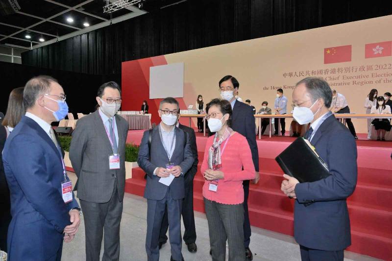 林鄭月娥今早視察行政長官選舉主投票站及中央點票站。(政府新聞處) 林鄭月娥表示,2022年行政長官選舉是經完善選舉制度下的第三場重要選舉。全體工作人員謹守崗位,熟悉程序,對於確保這次選舉順利舉行至關重要。她希望相關工作人員能全情投入,為香港辦好這場具歷史性的選舉。 林鄭月娥指出,中央完善特區選舉制度,為全面落實“愛國者治港”原則提供了堅實的保障。選舉委員會界別分組一般選舉及立法會換屆選舉已分別於去年9月19日及12月19日順利舉行,政府會一如既往,全力確保2022年行政長官選舉在公平、公正和誠實的原則下高效有序地舉行。她亦呼籲選舉委員會委員於明日踴躍在2022年行政長官選舉中投票。(完) 【編輯:凌玉辉】