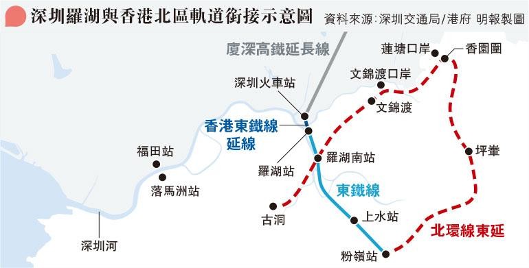 深圳羅湖口岸與香港北部都會區接軌示意圖 製圖:明報 今年一月,羅湖深圳火車站接入贛深高鐵,正式進入高鐵時代,臨近的羅湖口岸成為繼福田高鐵站後第二個連接高鐵的深港口岸。另外,深圳亦會在文錦渡、蓮塘口岸預留與香港北環線東延的銜接條件,以呼應香港的北部都會區鐵路發展策略。 隨著香港東鐵綫過海段即將開通,“北延南拓”之後,從羅湖就可以直達港島,兩地通勤便利性大大提昇。不少港人表示,今後在兩地可選工作地點大為增加,工作機會也可以變多,真正感受到大灣區帶來的廣闊發展空間。 深圳市人大代表閔齊雙認為,未來港鐵東鐵綫的引入和羅湖口岸的重建將推動深港交通通勤化,助力深港社會融合,帶動片區整體發展,推動“通道經濟”向“產業經濟”轉型,實現口岸“客流、物流、資金流、信息流+通關+服務”一體化聯動,打造灣區樞紐、深港新中心。