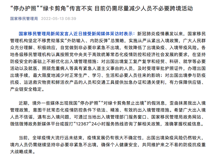 香港中通社5月13日電 中國國家移民管理局新聞發言人13日接受新聞媒體採訪時表示,近期,境外一些媒體出現中國“停辦護照”“對綠卡剪角禁止出境”的假消息,歪曲抹黑中國出入境管理政策,意圖干擾中國常態化疫情防控條件下依法、精準、有效的出入境管理措施。