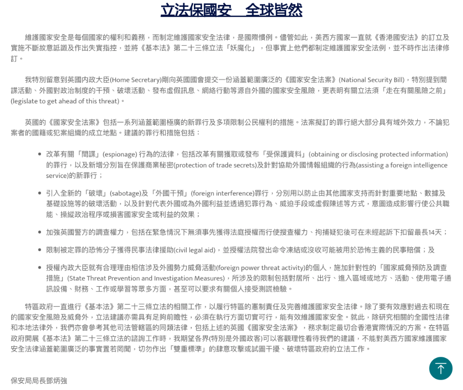 特區政府官網截圖 事實上,美西方國家一直戴有色眼鏡看中國及香港特區。對《香港國安法》的訂立及實施就不斷故意詆毀及作出失實指控,並將基本法第23條立法“妖魔化”。 鄧炳強的看法,顯然有“學你那套,你還會說什麼嗎”的用意。 英國的《國家安全法案》是怎麼規定的? 英國內政大臣11日向英國國會提交一份涵蓋範圍廣泛的《國家安全法案》,前身為《反國家威脅法案》,該法案匯集了重要的新措施,以進一步保護英國的國家安全,並使現有的反間諜法現代化以反映現代威脅。法案中特別提到間諜活動、外國對政治制度的乾預、破壞活動、發布虛假訊息、網路行動等源自外國的國家安全風險,更表明有關立法須“走在有關風險之前,在造成損害之前的更早階段進行逮捕”。