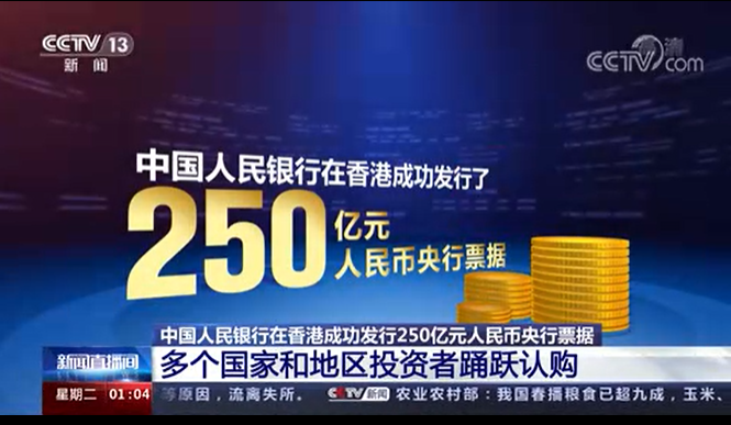 央視新聞報道截圖 目前,中國人民銀行常態化在香港發行人民幣央行票據,不僅豐富了香港市場人民幣投資產品系列和流動性管理工具,而且帶動了境內金融機構、企業等其他主體在離岸市場發行人民幣債券。中國央行表示,近年來,在離岸市場發行的人民幣國債、金融債券和企業債券不斷增加,發行方式和發行地點日益多樣化,表明香港人民幣央行票據對於促進離岸人民幣市場發展發揮了積極作用。 據業內分析師介紹,發行央票是回收流動性,央票到期則為注入流動性,中國央行在香港發行央票可以理解為調節香港離岸人民幣市場的流動性。離岸央票的常態化發行,短期有助於人民幣匯率保持穩定;中長期建立更加完善的香港人民幣債券收益率曲線,有助於推動人民幣國際化。(完) 【編輯:王軼南】