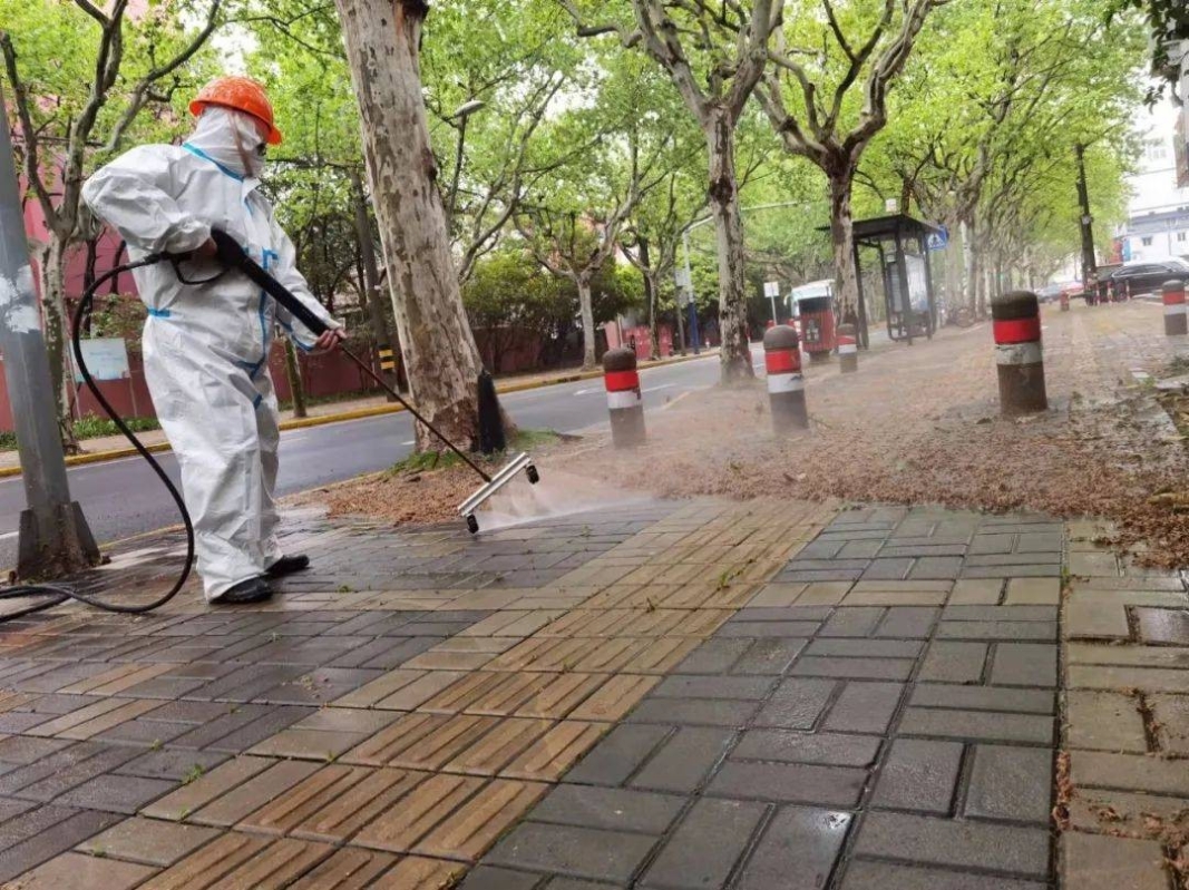 環衛人員正在進行消殺街作業 圖源:上海發佈 環衛部門對中小道路、背街小巷、斷頭路、橋洞隧道、高架橋蔭、上下匝口坡道下、機非隔離帶、綠化隔離帶以及配送寄遞等流動人員易聚集區域,進行全面清理。