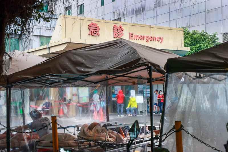 5月26日,新北市一家大型醫院,急診室外搭起臨時病床,醫護人力出現不足的情況。 香港中通社圖片 當天新增本土病例年齡介於未滿5歲至90歲以上,病例分佈遍及全天22個縣市,其中新北市、台中市、高雄市、桃園市新增病例數破萬,以新北市1.9萬例最多。 新增126例本土死亡病例,年齡介於10多歲至90歲以上,皆屬重度感染個案、113例具慢性病史、52例無疫苗接種。此外確診病例中增加343例中、重症患者,同創單日新高。 距上一次單日新增破9萬過去一周,指揮中心指揮官陳時中稱,過去一周屬於此輪疫情“高原穩定期”,很有可能維持穩定的單日新增病例數約2周。 指揮中心統計,截至目前台灣累計173萬5067例確診新冠肺炎,其中172萬2243例為本土病例,死亡病例累計1784例。(完) 【編輯:李雪萍】