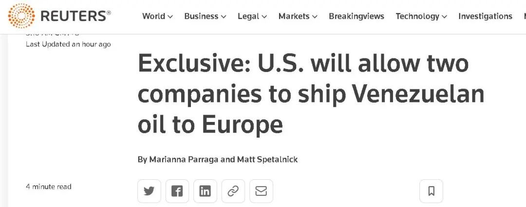 路透社報道截圖 路透社稱拜登當局給委內瑞拉石油開綠燈的一個核心前提,是“只能運給歐洲”。獲得批准的這兩家公司分別是意大利的Eni SpA 和西班牙的 Repsol SA,它們是目前僅有的兩家與委內瑞拉的國有石油公司成立了合資公司的歐洲企業。儘管美國、印度以及法國的石油公司也在游說美國政府放行與委內瑞拉的石油交易,但目前尚未獲準。不過美國政府早前已允許美國的雪佛龍公司與委內瑞拉方面就繼續開展業務進行談判。