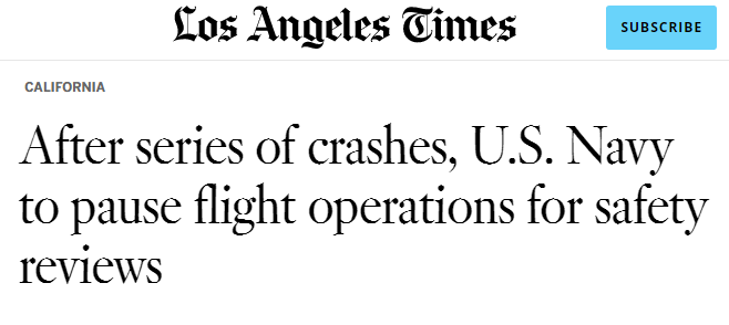 美國洛杉磯時報報道截圖 報道稱,該命令是在本月發生三起涉及美國海軍和海軍陸戰隊飛機的墜機事故之後發佈的。
