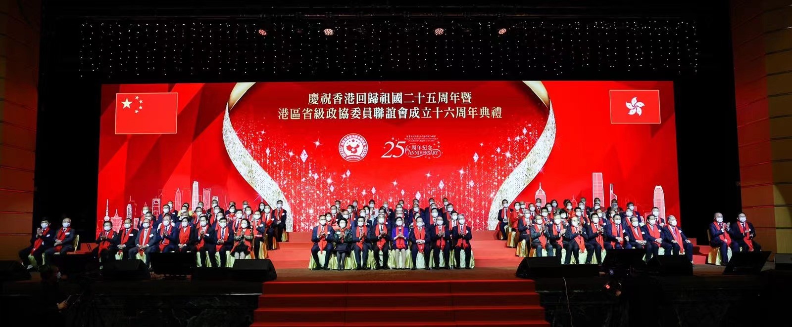 香港中通社6月16日電 港區省級政協委員聯誼會(聯誼會)16日晚舉行“慶祝香港回歸祖國25周年暨聯誼會成立16周年典禮”,逾千名嘉賓與會員一同見證。 當日晚上,一眾主禮嘉賓在銀樂隊的伴奏下列隊進場,慶典在全場奏唱國歌的激昂歌聲中拉開序幕。大會首先播放回顧視頻,重溫聯誼會發展歷程。 全國政協副主席梁振英、香港特區行政長官林鄭月娥、香港特區候任行政長官李家超、香港中聯辦副主任譚鐵牛、駐港公署特派員劉光源、駐港維護國家安全公署副署長孫青野、香港特區政府財政司司長陳茂波、律政司司長鄭若驊等蒞臨主禮。