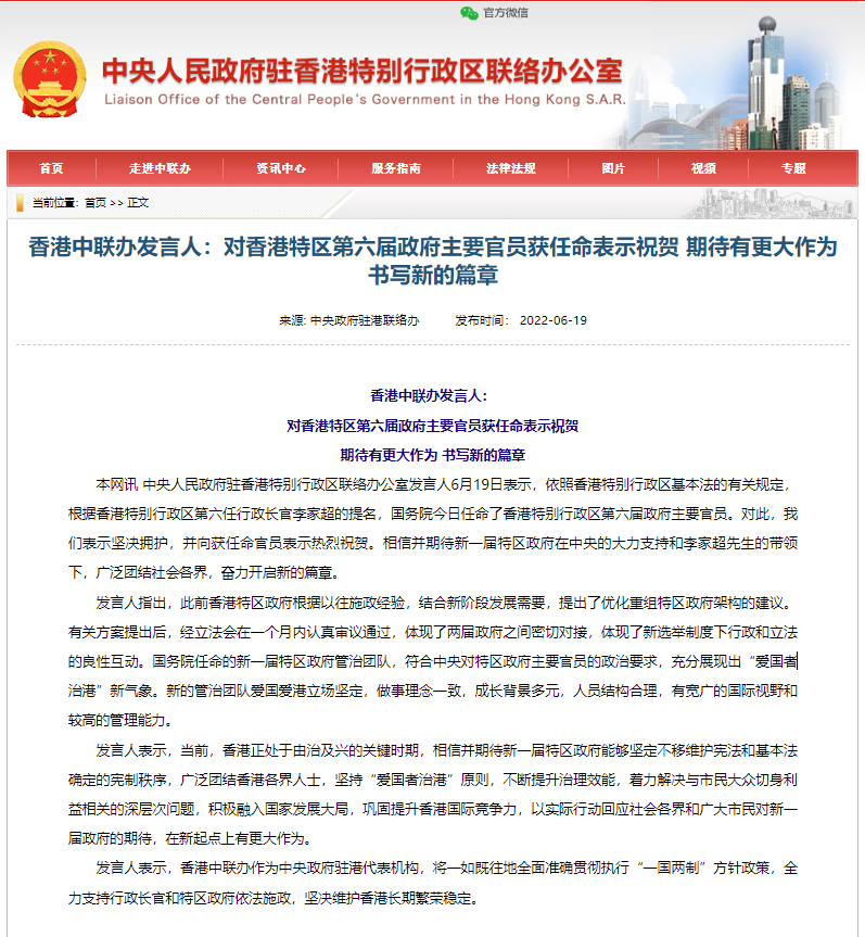 香港中通社6月19日電 中央人民政府駐香港特別行政區聯絡辦公室發言人6月19日表示,依照香港特別行政區基本法的有關規定,根據香港特別行政區第六任行政長官李家超的提名,國務院今日任命了香港特別行政區第六屆政府主要官員。對此,我們表示堅決擁護,并向獲任命官員表示熱烈祝賀。相信并期待新一屆特區政府在中央的大力支持和李家超先生的帶領下,廣泛團結社會各界,奮力開啟新的篇章。