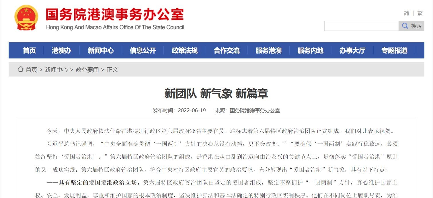 國務院港澳辦祝賀香港第六屆管治團隊組成:新團隊、新氣象、新篇章香港中通社6月19日電 中央人民政府19日依法任命香港特別行政區第六屆政府26名主要官員。國務院港澳事務辦公室發表評論文章對此表示祝賀,並指這標志著第六屆特區政府管治團隊正式組成。
