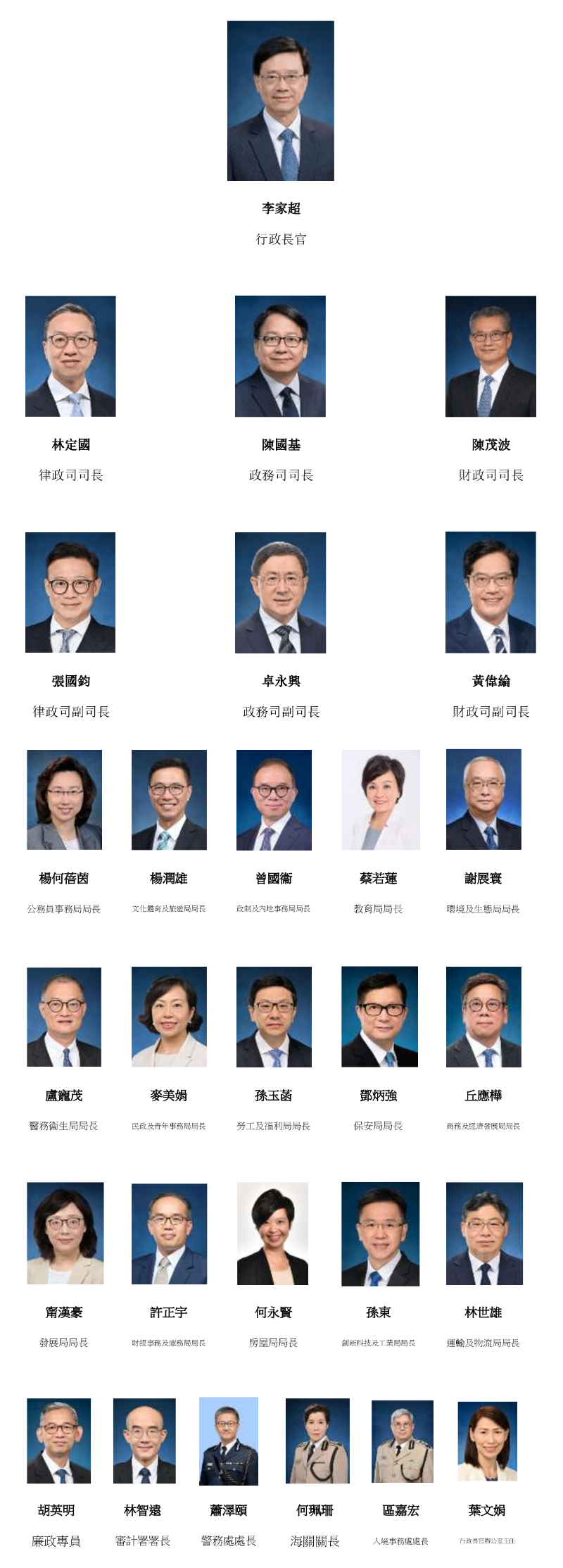 通說:父親節這天 李家超的選擇6月19日,依照香港特別行政區基本法的有關規定,根據香港特別行政區第六任行政長官李家超的提名,國務院任命了香港特別行政區第六屆政府主要官員,將於2022年7月1日就職。 任命如下: 陳國基任政務司司長; 陳茂波任財政司司長; 林定國任律政司司長; 卓永興任政務司副司長; 黃偉綸任財政司副司長; 張國鈞任律政司副司長; 楊何蓓茵任公務員事務局局長; 麥美娟任民政及青年事務局局長; 鄧炳強任保安局局長; 曾國衛任政制及內地事務局局長; 盧寵茂任醫務衛生局局長; 許正宇任財經事務及庫務局局長; 蔡若蓮任教育局局長; 寧漢豪任發展局局長; 丘應樺任商務及經濟發展局局長; 何永賢任房屋局局長; 林世雄任運輸及物流局局長; 孫玉菡任勞工及福利局局長; 謝展寰任環境及生態局局長; 孫東任創新科技及工業局局長; 楊潤雄任文化體育及旅遊局局長; 胡英明任廉政專員; 林智遠任審計署署長; 蕭澤頤任警務處處長; 區嘉宏任入境事務處處長; 何佩珊任海關關長。 第六屆特區政府主要官員及架構圖: