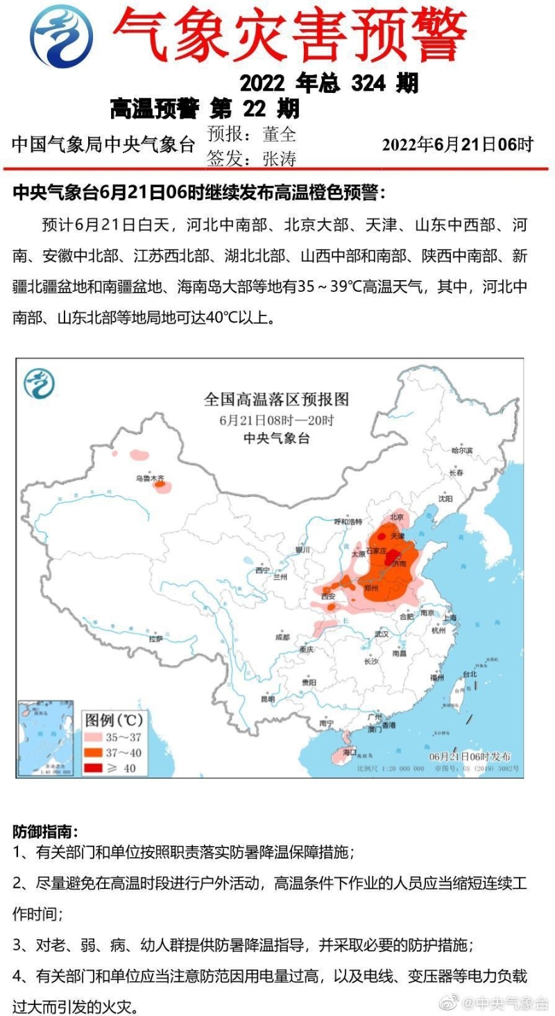 中央氣象台發佈高溫橙色預警 中央氣象台21日06時繼續發佈高溫橙色預警:預計6月21日白天,河北中南部、北京大部、天津、山東中西部、河南、安徽中北部、江蘇西北部、湖北北部、山西中部和南部、陝西中南部、新疆北疆盆地和南疆盆地、海南島大部等地有35~39℃高溫天氣,其中,河北中南部、山東北部等地局地可達40℃以上。 夏至這天雖然白晝最長,太陽角度最高,但并不是一年中天氣最熱的時候。因為,接近地表的熱量,這時還在繼續積蓄,并沒有達到最多的時候。所謂“熱在三伏”,暑熱天氣最鼎盛的時段,要到7月中旬到8月中旬。 6月,中國進入台風季,夏至後也是初台風最扎堆的時節。# 【編輯:王軼南】