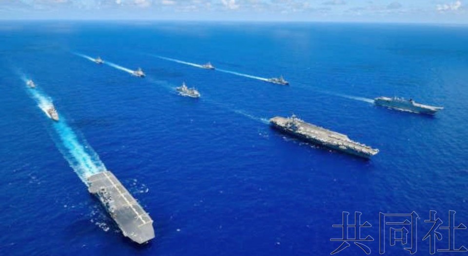 前列由左至右為日本海上自衛隊護衛艦“出雲”號、美國海軍核動力航母“亞伯拉罕・林肯”號、澳大利亞海軍兩棲攻擊艦“堪培拉”號。圖源:共同社 日本海上自衛隊25日發佈消息稱,日軍出動了護衛艦“出雲”號和“高波”號,美軍投入了核動力航母“亞伯拉罕・林肯”號,澳大利亞投入了兩棲攻擊艦“堪培拉”號。 “出雲”號和“高波”號6月至10月被派遣執行長期任務,在印度太平洋地區與各國開展訓練。美軍還派出了巡洋艦和驅逐艦共4艘,澳大利亞還派出了護衛艦和補給艦各1艘。(完) 【編輯:王軼南】