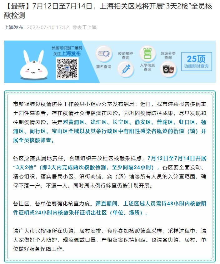 上海發佈官方微博截圖 上海市新冠肺炎疫情防控工作領導小組辦公室發佈消息指,由於連續報告多例本土陽性感染者,存在疫情社會傳播潛在風險。為盡早發現和控制疫情風險,決定7月12日至7月14日,上海相關區域將開展“3天2檢”全員核酸檢測(即3天內完成兩次核酸檢測,至少間隔24小時)。具體區域包括黃浦區、徐匯區、長寧區、靜安區、普陀區、虹口區、楊浦區、閔行區、寶山區全域以及其餘行政區中有陽性感染者軌跡的街道(鎮)。 篩查期間,上述區域人員需持48小時內核酸陰性證明或24小時內核酸采樣證明出社區(單位、場所)。 西安提前結束臨時性管控 早前宣佈從7月6日0時起實施7天臨時性管控的陝西西安市在臨時性管控3天之後,多個社區陸續發佈消息,自10日0時起,取消全市臨時性管控,有序恢復常態化管控措施。多家商場發佈通告稱10日起全面恢復營業和堂食。
