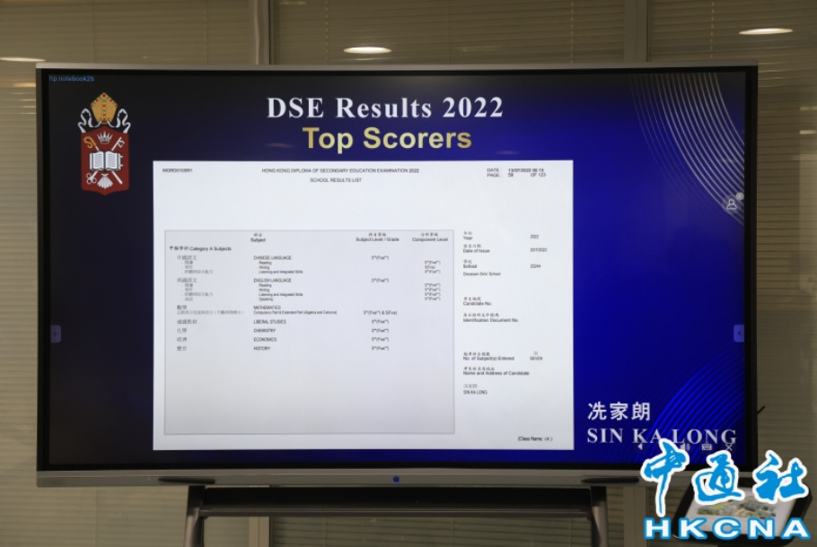 香港新聞網7月20日電(記者 曹文毓)7月20日,香港2022中學文憑試(DSE)放榜,今年有8名學生考獲7科5**成績,成為狀元,分別是5男3女,來自8間學校。