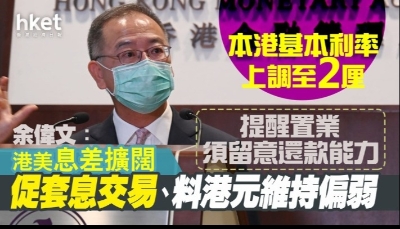 余偉文說,港美在隔夜及1個月的拆息差距較中長期拆息差距大,但過去數月拆息已逐步上升。隨著美息上升,他預料,港元拆息升勢將會持續,甚至加快,但速度要視乎本地市場港幣資金供求,他提醒市民要對港元拆息上升有所準備。 在銀行息率方面,余偉文強調,銀行會因應自己的資金成本,決定調整息率的時機和幅度,他留意到部分銀行已上調新造按揭貸款利率鎖息上限,認為未來或會進一步上調存貸息率。提醒市民置業或其他投資行動時,要考慮利率因素。