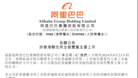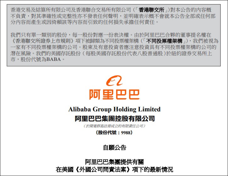 香港新聞網8月1日電 阿里巴巴集團控股有限公司1日在港交所發佈公告,回應被美國證交會列入預摘牌名單一事。阿里巴巴表示,將繼續留意市場動態,遵守適用的法律法規,并努力保持同時在紐交所和香港聯交所的兩地上市地位。