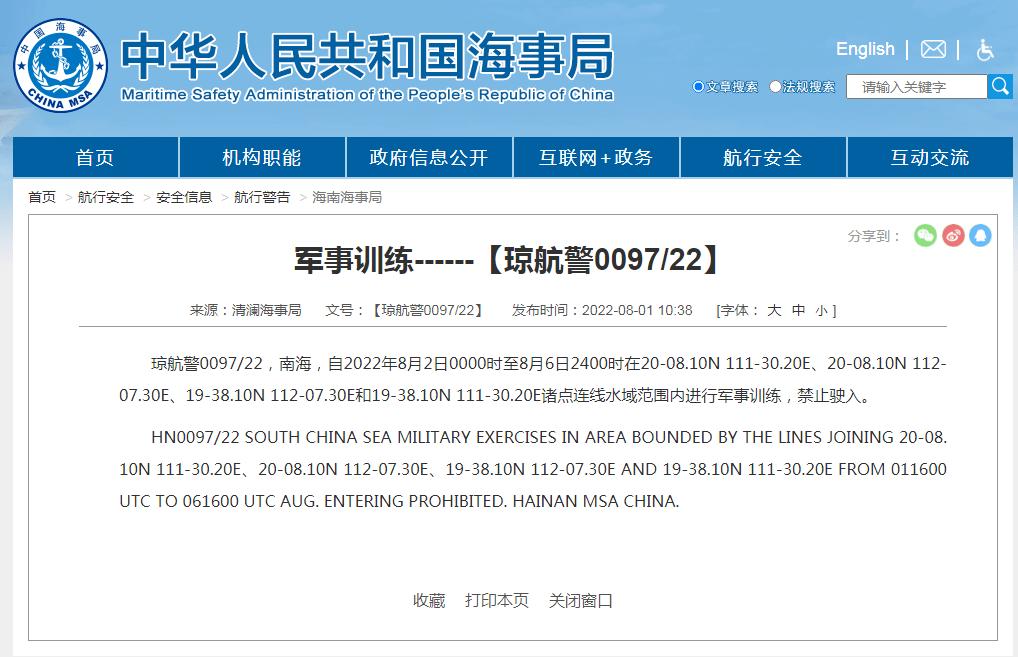 香港中通社8月2日電 據央視新聞客戶端報道,來自中國海事局消息,清瀾海事局發布航行警告,從8月2日0000時至8月6日2400時在南海部分水域範圍內進行軍事訓練,禁止駛入。大連海事局的航行警告信息顯示,渤海北部,從8月1日1400時至8月4日2400時將在渤海北部部分水域進行實彈射擊,禁止駛入。(完)